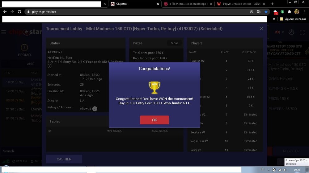 Вчера получил свой выигрыш в рублях 13,5 тыс и все это отметил и пропустил покерный турнир, думал все упустил 1 место игрок месяца, и сегодня с утра удивился Ура Ура Ура мы лучшие 1 место за нами))) называется не зря бухали)))и играли))вчера чуть мяса 1 кг свинины купил замариновал в минералке с луком сделаю шашлыку!!!буду жарить шашлык фотки с огорода сделаю позже!))1 балл