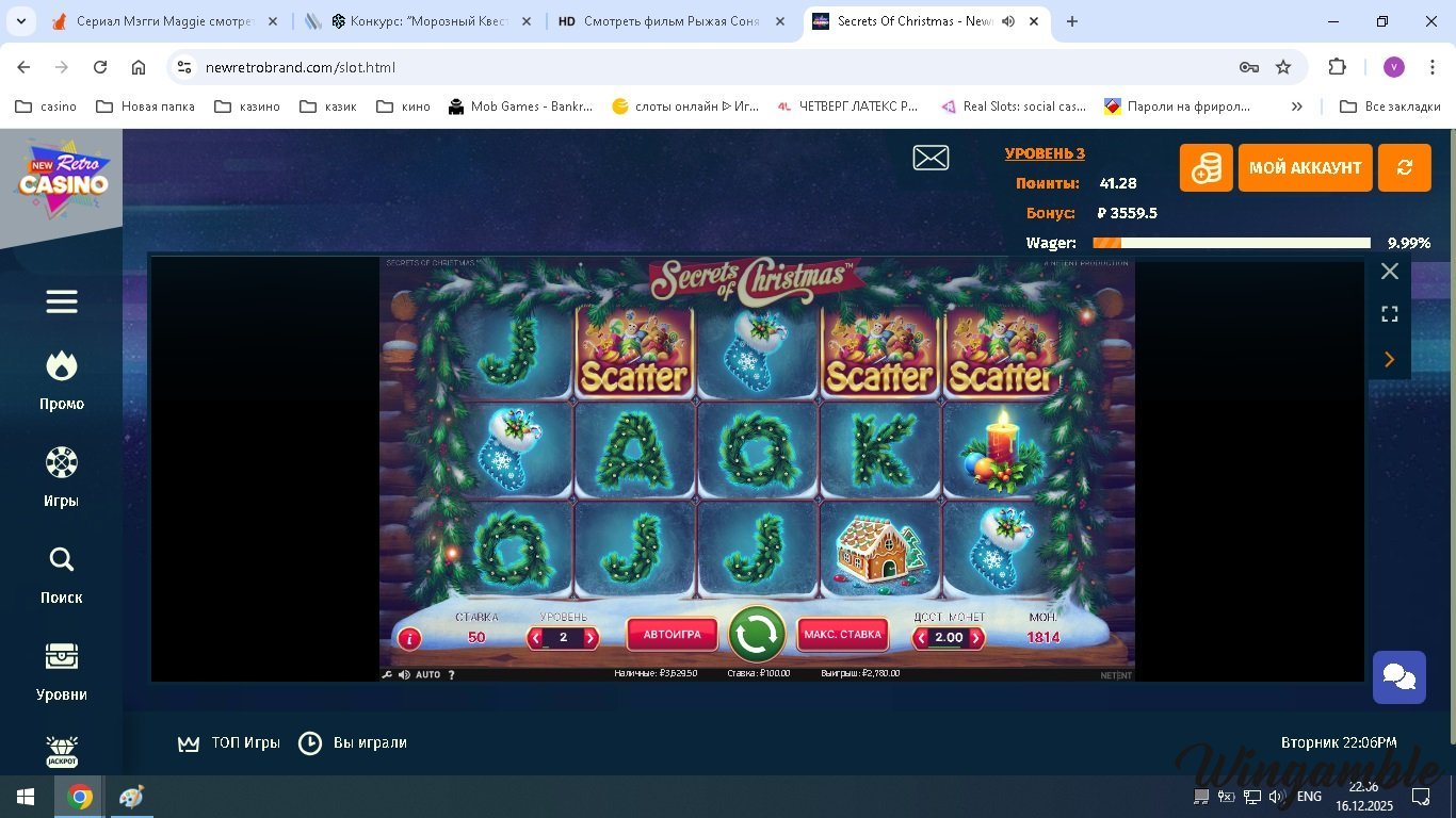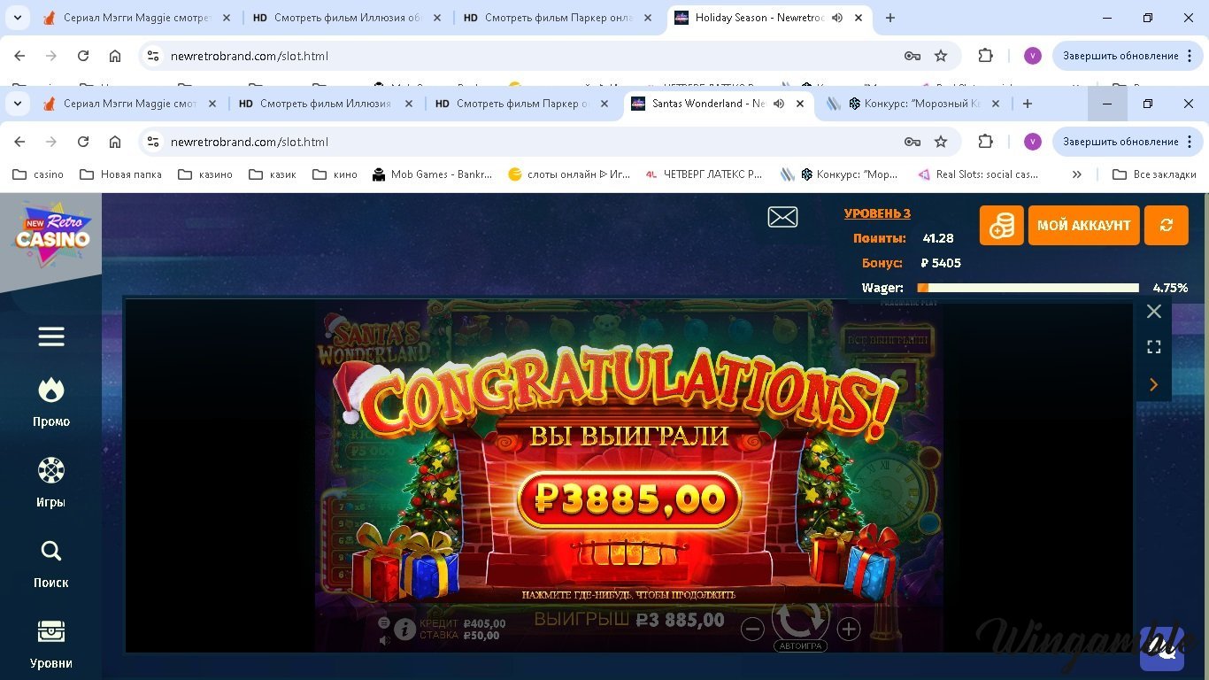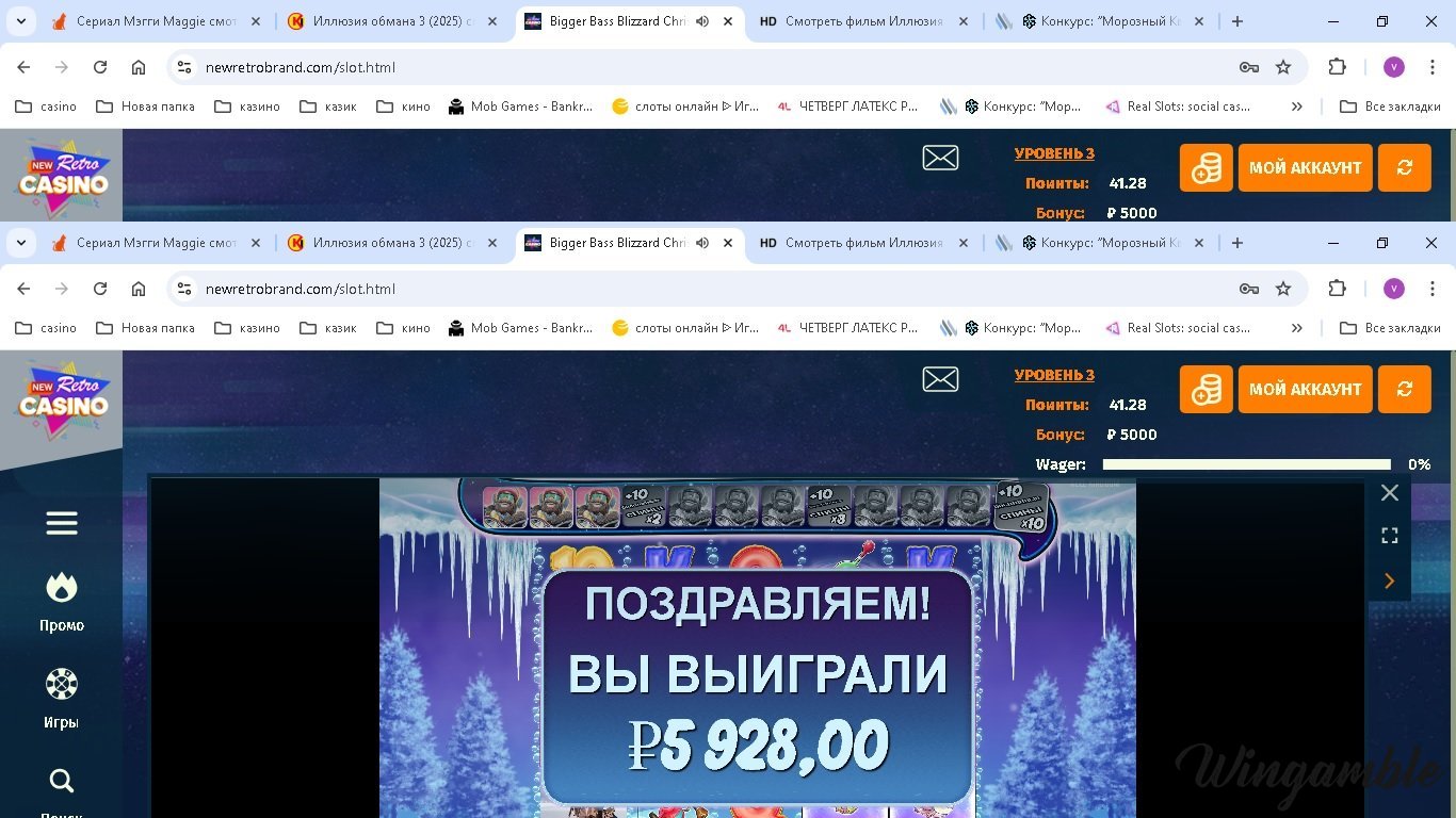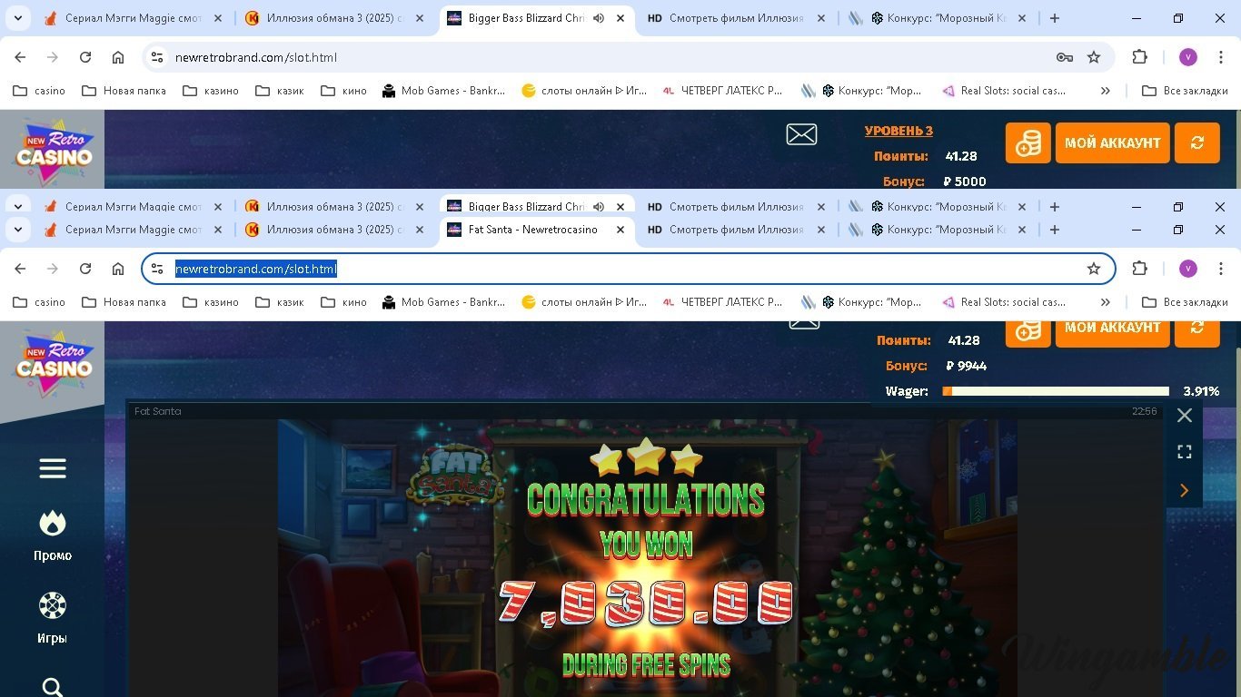 NewRetroCasino Опубликовано 15 декабря, 2025 Опубликовано 15 декабря, 2025 ❄️ Конкурс: “Морозный Квест Деда Винтера” ❄️ ✨ Период проведения: до 30 декабря 2025 года (включительно) 🏆 Призовые места: 🥇 1 место — 250 FS по ставке 10 рублей (вейджер х30) - Max.cashout - 6000 рублей 🥈 2 место — 150 FS по ставке 10 рублей (вейджер х30) - Max.cashout - 4000 рублей 🥉 3 место — 100 FS по ставке 5 рублей (вейджер х30) - Max.cashout - 2000 рублей 🎯 УСЛОВИЯ УЧАСТИЯ: Зарегистрироваться на сайте казино NewRetroCasino. Подтвердить электронную почту. Активировать бездепозитный бонус в размере 5000 рублей с вейджером х40 по промокоду WINGAMBLE. (Конкурсный баланс, cashout невозможен). Данный пункт выполняется по желанию. 🎰 УСЛОВИЕ ПОБЕДЫ: Каждый участник должен продемонстрировать свой максимальный выигрыш, опубликовав скриншот с результатом, на котором отчётливо видны выигрыш, дата, время и логин игрока, в теме конкурса. Принимаются скриншоты из любых зимних слотов. 🔹 Ограничение: не более одного скриншота с одного слота за весь период конкурса. 📊 Итоговый результат участника формируется на основе: — количества задействованных зимних слотов; — размера зафиксированных выигрышей. 👉 Чем больше различных зимних слотов использовано и чем выше зафиксированные выигрыши, тем выше шансы на призовые места. (Скриншоты не зимних слотов не принимаются - эти слоты зачарованы лично Дедом Винтером 👑🧊) Результаты будут опубликованы в течение 72 часов после окончания конкурса. 🔥 Бонусное задание: Займите любое место в ежедневном турнире "FreeRoll Bonus Battle" и/или "Weekend FreeRoll Freespins Battle" и получите бездепозитный промокод на 250 FS по ставке 10 рублей (вейджер х30, макс. вывод – 3000 рублей). Промокод будет отправлен личным сообщением на форуме после окончания конкурса. 🌈 Дополнительный приз: Предоставляется за любое занятое место в турнирах FreeRoll Bonus Battle и/или Weekend FreeRoll Freespins Battle (необходимо предоставить скриншот-подтверждение). 🌟 Не упустите свой шанс на бесплатные вращения! Зарегистрируйтесь сейчас на Это скрытое содержимое, пожалуйста Войти или Регистрация 1 1 Цитата