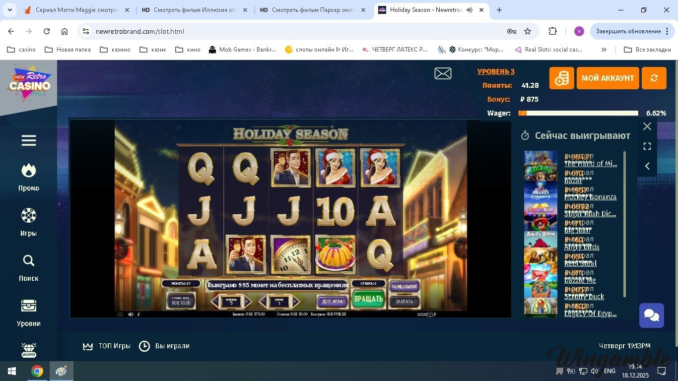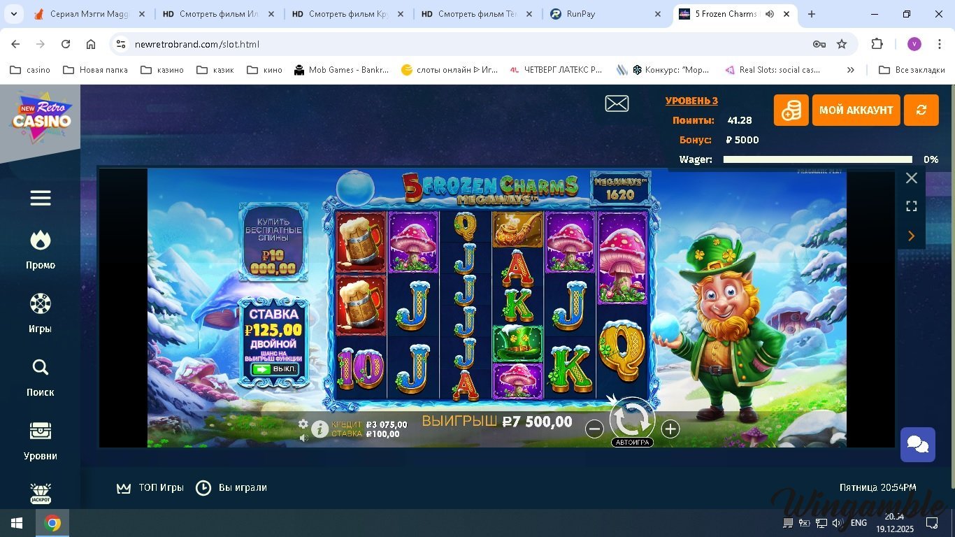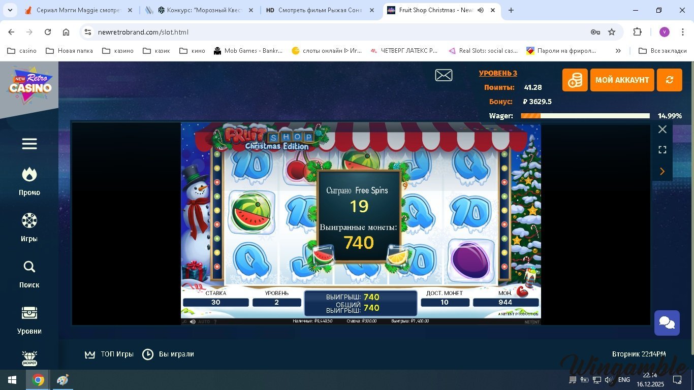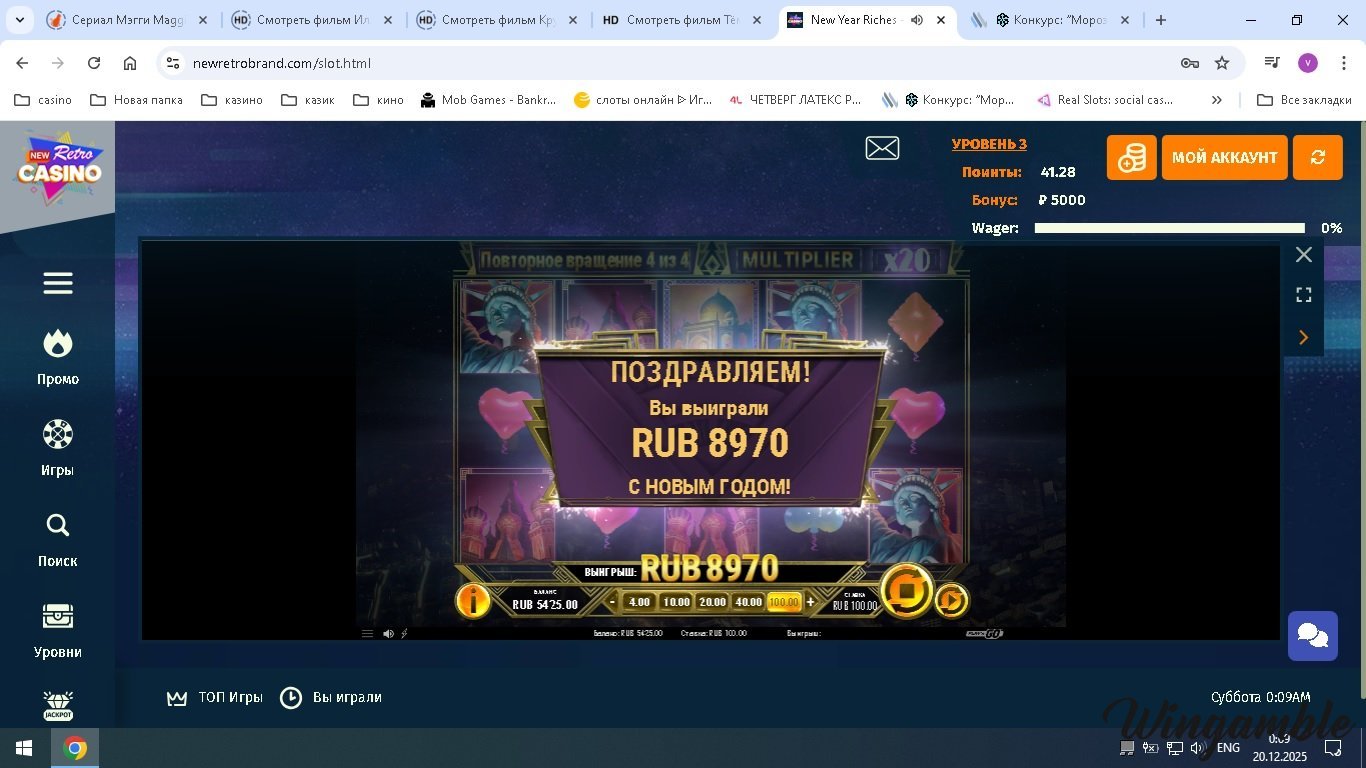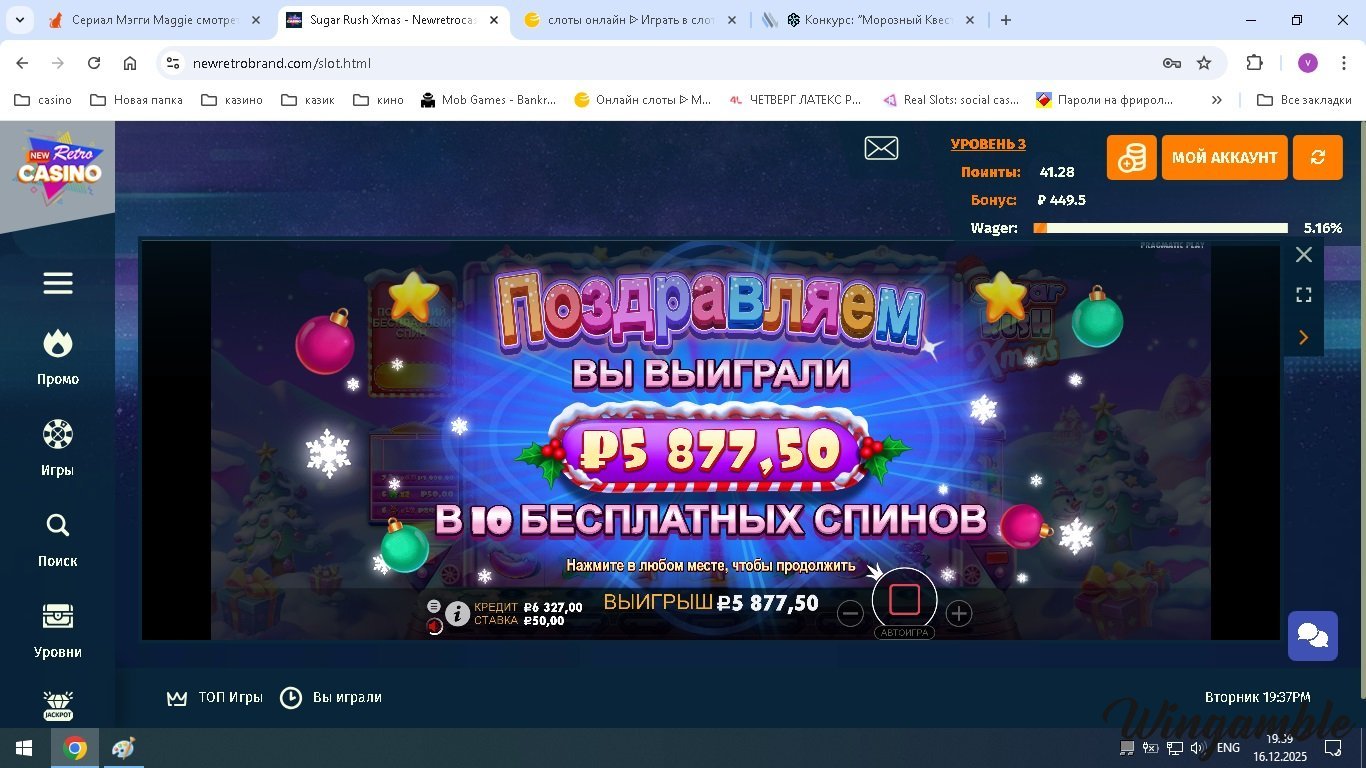 NewRetroCasino Опубликовано 15 декабря, 2025 Опубликовано 15 декабря, 2025 ❄️ Конкурс: “Морозный Квест Деда Винтера” ❄️ ✨ Период проведения: до 30 декабря 2025 года (включительно) 🏆 Призовые места: 🥇 1 место — 250 FS по ставке 10 рублей (вейджер х30) - Max.cashout - 6000 рублей 🥈 2 место — 150 FS по ставке 10 рублей (вейджер х30) - Max.cashout - 4000 рублей 🥉 3 место — 100 FS по ставке 5 рублей (вейджер х30) - Max.cashout - 2000 рублей 🎯 УСЛОВИЯ УЧАСТИЯ: Зарегистрироваться на сайте казино NewRetroCasino. Подтвердить электронную почту. Активировать бездепозитный бонус в размере 5000 рублей с вейджером х40 по промокоду WINGAMBLE. (Конкурсный баланс, cashout невозможен). Данный пункт выполняется по желанию. 🎰 УСЛОВИЕ ПОБЕДЫ: Каждый участник должен продемонстрировать свой максимальный выигрыш, опубликовав скриншот с результатом, на котором отчётливо видны выигрыш, дата, время и логин игрока, в теме конкурса. Принимаются скриншоты из любых зимних слотов. 🔹 Ограничение: не более одного скриншота с одного слота за весь период конкурса. 📊 Итоговый результат участника формируется на основе: — количества задействованных зимних слотов; — размера зафиксированных выигрышей. 👉 Чем больше различных зимних слотов использовано и чем выше зафиксированные выигрыши, тем выше шансы на призовые места. (Скриншоты не зимних слотов не принимаются - эти слоты зачарованы лично Дедом Винтером 👑🧊) Результаты будут опубликованы в течение 72 часов после окончания конкурса. 🔥 Бонусное задание: Займите любое место в ежедневном турнире "FreeRoll Bonus Battle" и/или "Weekend FreeRoll Freespins Battle" и получите бездепозитный промокод на 250 FS по ставке 10 рублей (вейджер х30, макс. вывод – 3000 рублей). Промокод будет отправлен личным сообщением на форуме после окончания конкурса. 🌈 Дополнительный приз: Предоставляется за любое занятое место в турнирах FreeRoll Bonus Battle и/или Weekend FreeRoll Freespins Battle (необходимо предоставить скриншот-подтверждение). 🌟 Не упустите свой шанс на бесплатные вращения! Зарегистрируйтесь сейчас на Это скрытое содержимое, пожалуйста Войти или Регистрация 1 1 Цитата