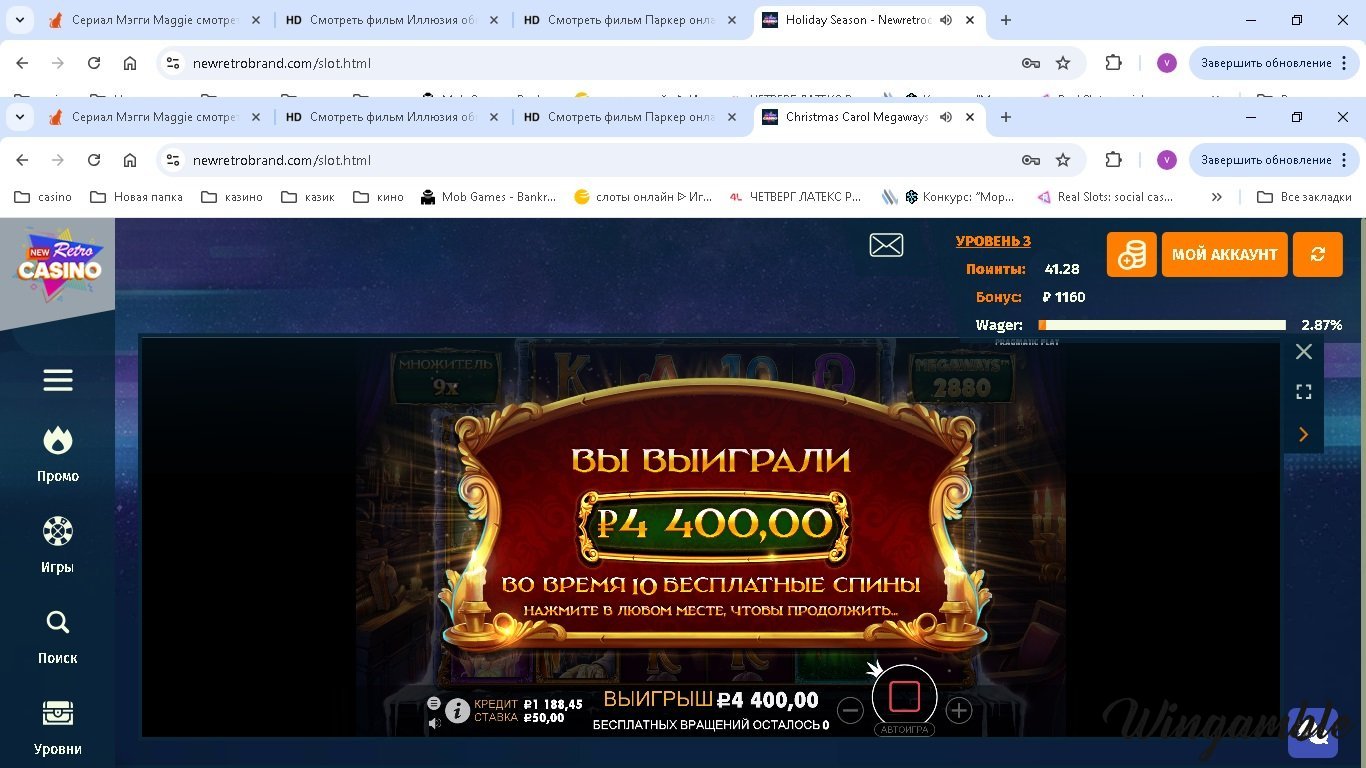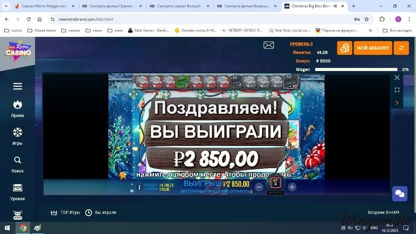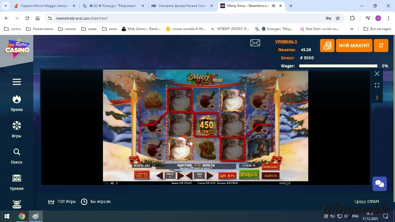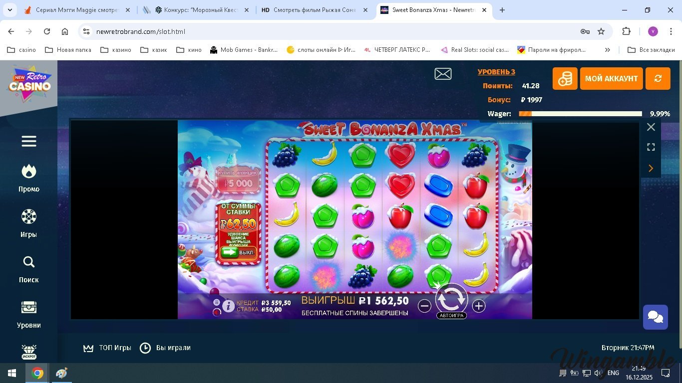 NewRetroCasino Опубликовано 15 декабря, 2025 Опубликовано 15 декабря, 2025 ❄️ Конкурс: “Морозный Квест Деда Винтера” ❄️ ✨ Период проведения: до 30 декабря 2025 года (включительно) 🏆 Призовые места: 🥇 1 место — 250 FS по ставке 10 рублей (вейджер х30) - Max.cashout - 6000 рублей 🥈 2 место — 150 FS по ставке 10 рублей (вейджер х30) - Max.cashout - 4000 рублей 🥉 3 место — 100 FS по ставке 5 рублей (вейджер х30) - Max.cashout - 2000 рублей 🎯 УСЛОВИЯ УЧАСТИЯ: Зарегистрироваться на сайте казино NewRetroCasino. Подтвердить электронную почту. Активировать бездепозитный бонус в размере 5000 рублей с вейджером х40 по промокоду WINGAMBLE. (Конкурсный баланс, cashout невозможен). Данный пункт выполняется по желанию. 🎰 УСЛОВИЕ ПОБЕДЫ: Каждый участник должен продемонстрировать свой максимальный выигрыш, опубликовав скриншот с результатом, на котором отчётливо видны выигрыш, дата, время и логин игрока, в теме конкурса. Принимаются скриншоты из любых зимних слотов. 🔹 Ограничение: не более одного скриншота с одного слота за весь период конкурса. 📊 Итоговый результат участника формируется на основе: — количества задействованных зимних слотов; — размера зафиксированных выигрышей. 👉 Чем больше различных зимних слотов использовано и чем выше зафиксированные выигрыши, тем выше шансы на призовые места. (Скриншоты не зимних слотов не принимаются - эти слоты зачарованы лично Дедом Винтером 👑🧊) Результаты будут опубликованы в течение 72 часов после окончания конкурса. 🔥 Бонусное задание: Займите любое место в ежедневном турнире "FreeRoll Bonus Battle" и/или "Weekend FreeRoll Freespins Battle" и получите бездепозитный промокод на 250 FS по ставке 10 рублей (вейджер х30, макс. вывод – 3000 рублей). Промокод будет отправлен личным сообщением на форуме после окончания конкурса. 🌈 Дополнительный приз: Предоставляется за любое занятое место в турнирах FreeRoll Bonus Battle и/или Weekend FreeRoll Freespins Battle (необходимо предоставить скриншот-подтверждение). 🌟 Не упустите свой шанс на бесплатные вращения! Зарегистрируйтесь сейчас на Это скрытое содержимое, пожалуйста Войти или Регистрация 1 1 Цитата