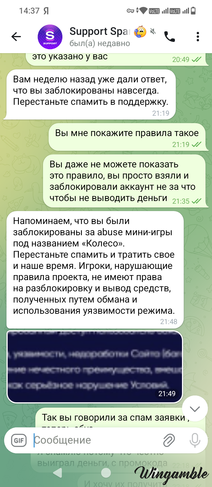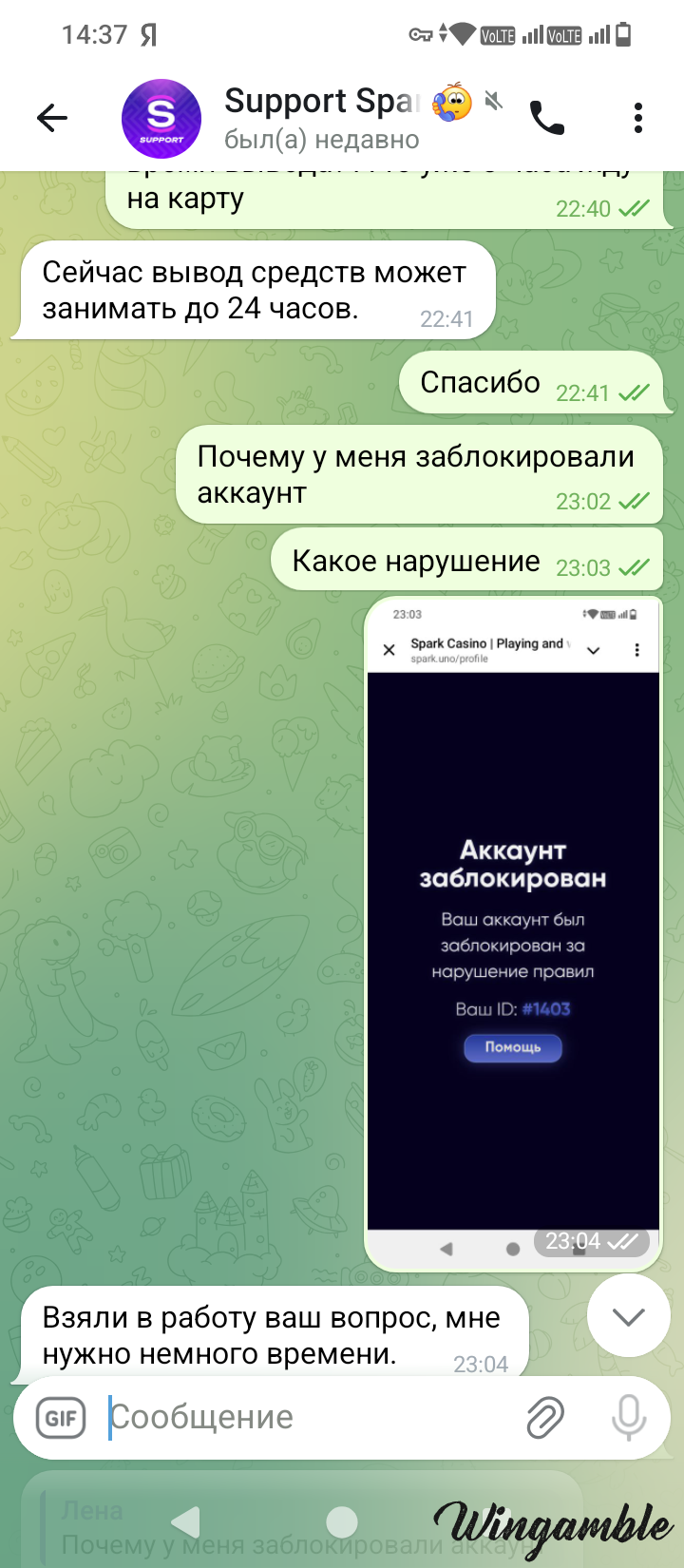 Oleg 2404 Опубликовано 8 часов назад Опубликовано 8 часов назад 18 января я получил промокод в канале на 5$ на казино spark . une выиграл с них 20000 тыс рублей поставил на вывод как через минут 40 может побольше мне прелатает блокировка аккаунта я пишу в поддержку что мне отвечают что заблокировали за спам заявки на оплату, через некоторое время они уже отвечают что заблокировали за абуз мини игры колеса, хотя я делал ставки по 200-400 рублей и были депозиты прошу почь ид1403 1 Цитата