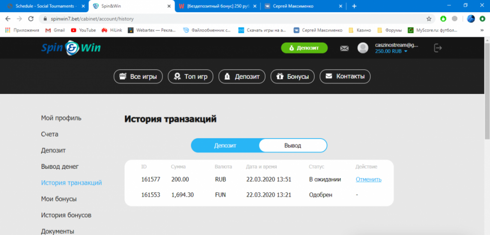 бездепозитный бонус 250 рублей бездепозитный бонус в SpinWin Casino