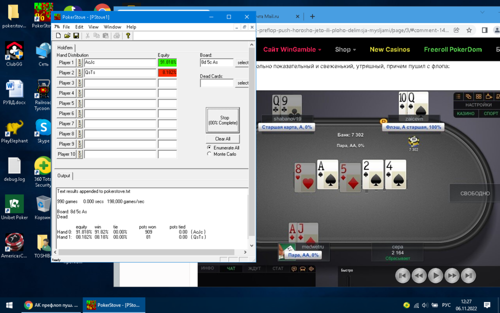 Ярослав Пучков Опубликовано 15 апреля, 2022 Опубликовано 15 апреля, 2022 Привет всем! По поводу АК. Дойл Брансон Легенда покера (на фото) В своей книге « Суперсистема» Раскрывает преимущества руки АК. Он утверждает что это не закрытая рука и она захватывает два диапазона вместо одного. В пример он приводит эксперимент который провёл со своими друзьями. Суть эксперимента такова что каждую раздачу они ставили по 100 баксов и делали шоу даун. У Брансона всегда была АК а удрузей карманки от ТТ до АА. Эксперимент показал что в большинстве случаев выигрывала рука АК. Как говорит сам автор это рука открытая. В отличие от АА или КК. ——— Что касается меня лично то эта рука работает в 90% случаев. Никакого предвзятого отношения я к ней не испытываю. Рука со своим характером. Если одномастная У вас доедет старший Flash. Если разномастная У вас доедет старший стрит. Согласен что в умелых руках и хуй балалайка Так что если вы попали в эти 10% то значит вы неправильно оценили ситуацию за столом. Что касается пуша то я вообще не вижу смысла делать его на префлопе. И это касается не только этой карманки. В покере наша задача забрать больший банк. А как вы собираетесь это сделать если на префлопе все сфолдили? Поэтому пересмотрите свою стратегию в отношении этой руки и успехов в катке?♣️ 1 1 1 Цитата