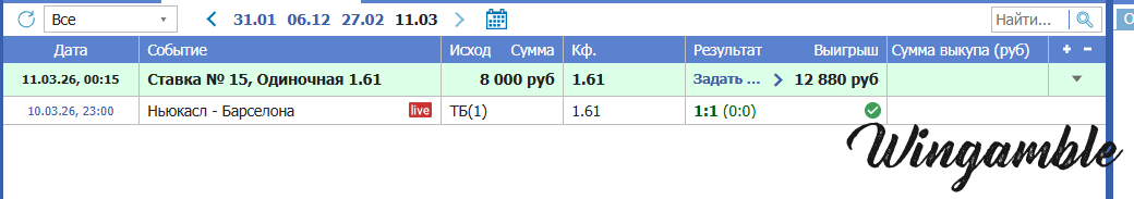 Turbo Опубликовано Вторник в 04:51 Автор Опубликовано Вторник в 04:51 Рубрика Тренд. Лига чемпионов. 23:00. Ньюкасл - Барса , тотал второй тайм больше 1 - Барса не играет 0-0 второй тайм к ряду в 12 матчах - Барса на чужом поле не играет 0-0 к ряду в 11 матчах - Барса сыграла к ярду 6 вторых таймов на тотал больше 1.5 - Барса в гостях сыграла 6 вторых таймов на тотал больше 1.5 - Ньюкасл дома пропускает во втором тайме в 5 из 6 матчей - Барса забивает во втором тайме в 22 из 23 крайних матчей - Барса с выезда забивает во втором тайме в 11 из 12 крайних матчей - Ньюкас забивает дома во втором тайме к ряду в 5 матчах Задача : Кеф на данный исход всего 1.2 , поэтому ставлю задау дождаться котировку 1.6 , такая будет минуте 61 и зайти на 8% ( 8000 р ) , если до данных цифр будет забит гол то ничего не берем. Цитата