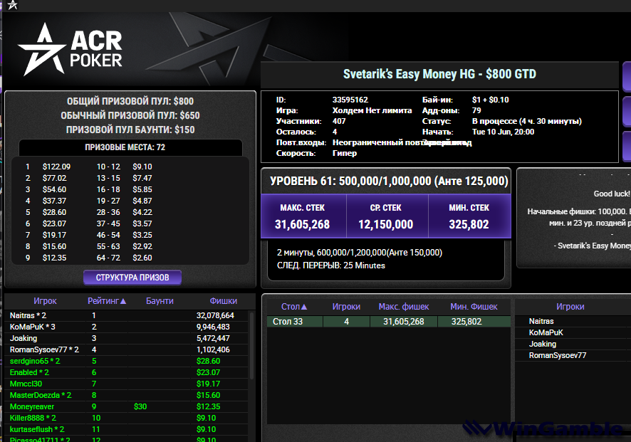 serdgino Опубликовано 9 января, 2024 Автор Опубликовано 9 января, 2024 Всем привет! сегодня вечер чудес однако , зарегился в трех туриках на АСР , одна фриха от Твина а в 21 мск ещё в двух за 1.1 и 2.2 баксика , во фрихе выиграл пару баксов а вот в туриках с баинами вышло не плохо.. удивительно но попал в обоих на финалку , только в одном на дележку согласился а в другом обидно ,терпения не хватила , со слабым тузом выставился... но результатом доволен ,давненько ничего путного не выигрывал у америкосов, всем удачи! 3 2 Цитата