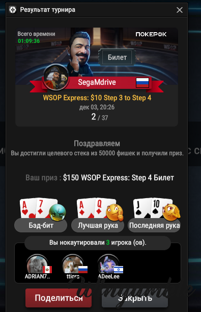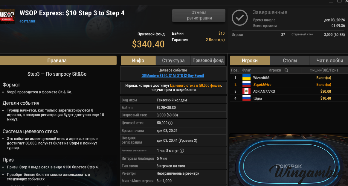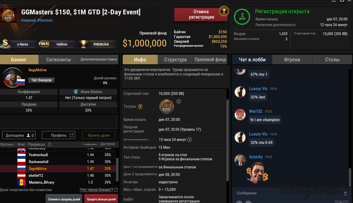 сейчас сделал регу на турик GGMasters за 150 зеленых , который выиграл с нуля,жалко что он, без нокаутов ,правда есть ещё вариант, сыграть супер степ на билет в 2.5 тыс баксов , но я решил сыграть в МТТ, выставил 20% на продажу, может кто купит.