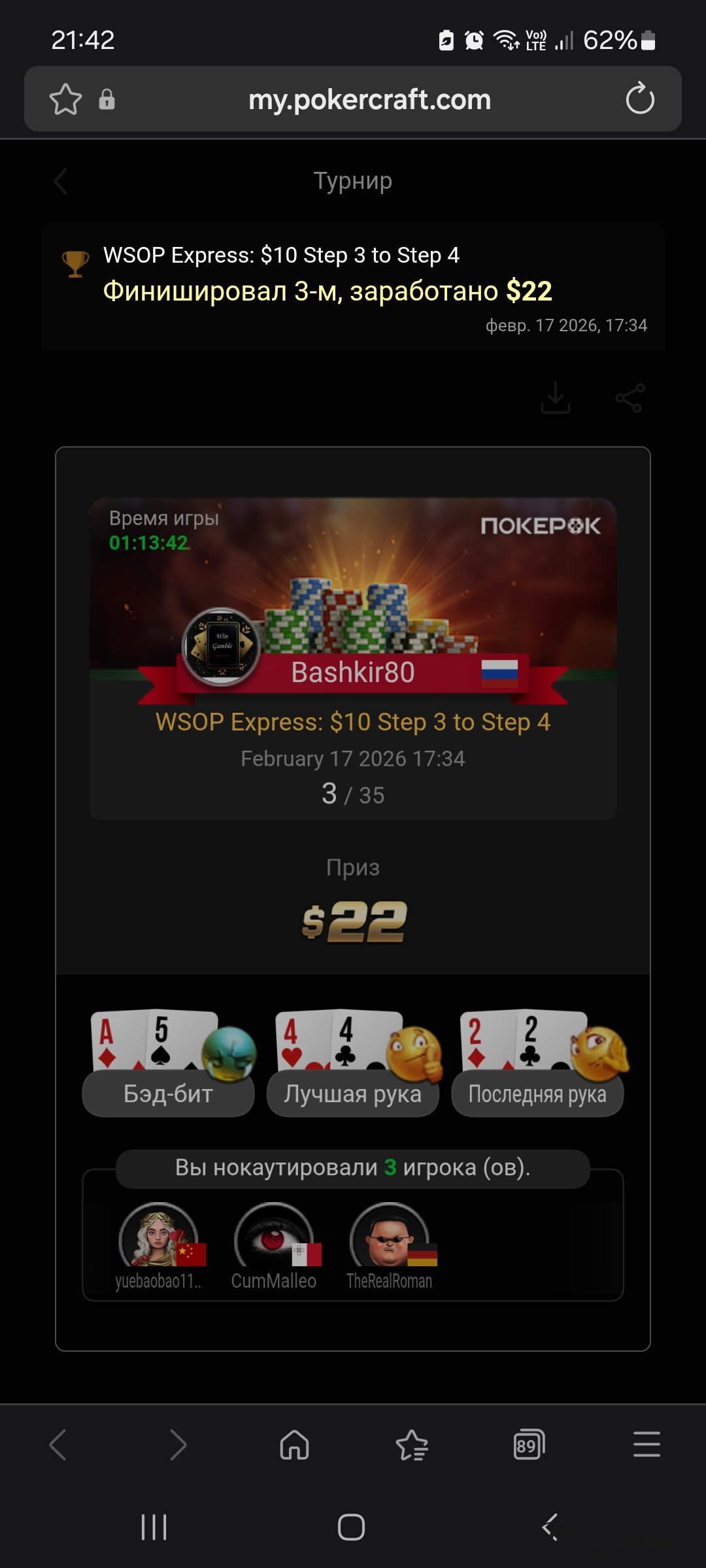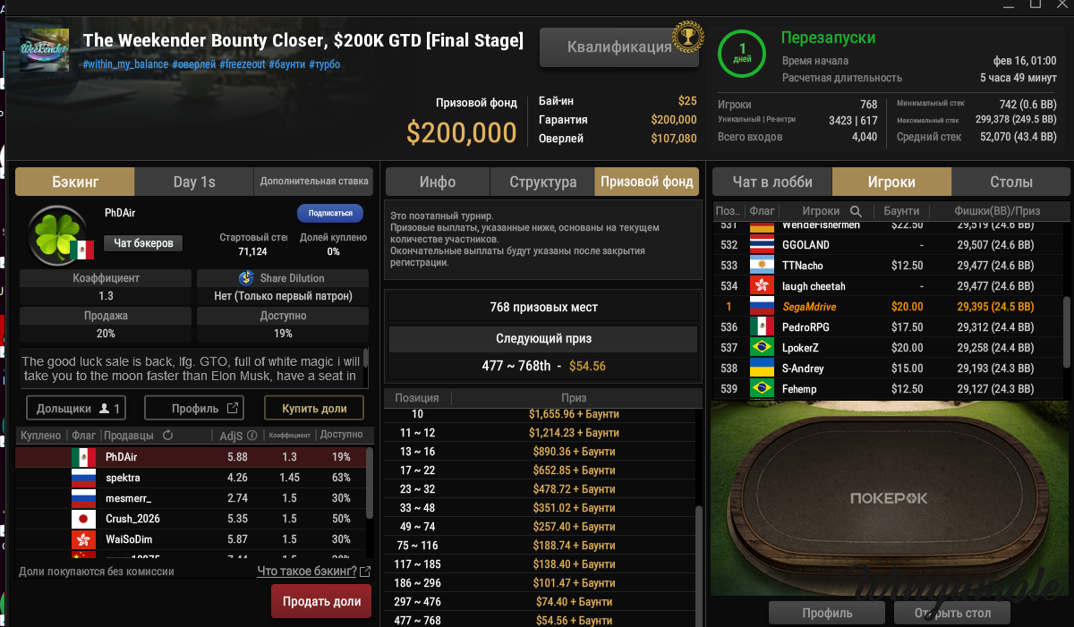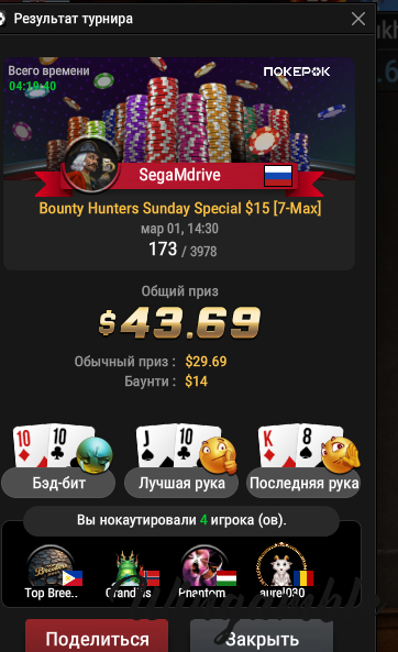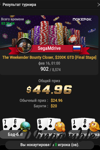 serdgino Опубликовано 14 февраля Автор Опубликовано 14 февраля все получилось в сателлите пройти в второй день , завтра ночью будет жарко , в час ночи начинается , радует ещё то ,что ты в втором дне уже в призах минимальных, правда стек пронес не большой, но попробую раскрутиться. всем удачи! 1 2 Цитата
