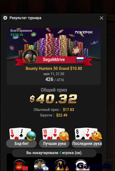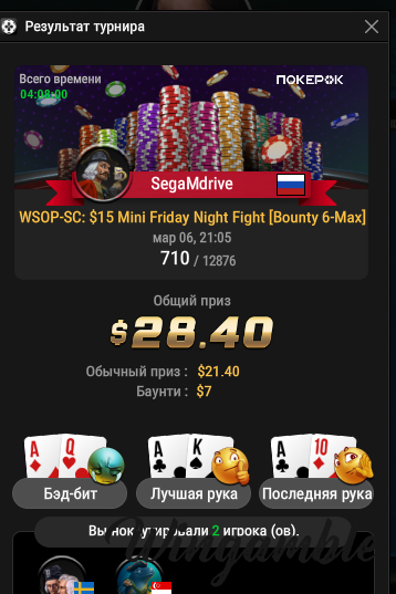 serdgino Опубликовано 13 апреля, 2025 Автор Опубликовано 13 апреля, 2025 Всем привет! не плохо покатал вечерком на покерке , а то всё в одну калитку, в турнире мистери за 15, не плохо зацепился, прошел такое килополе , стек был выше среднего и уже стал думать о финалке, выбил несколько игроков , золотого сундука правда не дали , самый большой был 150 баксов, но в конце турнира ,удача отвернулась от меня , все равно , я довольный результатом игры ,лег спать в 3 часа ночи! всем удачи! 2 3 Цитата