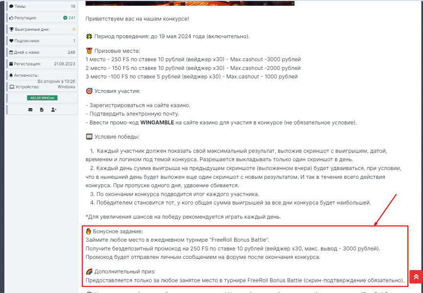 NewRetroCasino Опубликовано 13 мая, 2024 Опубликовано 13 мая, 2024 (изменено) Приветствуем вас на нашем конкурсе!🌟 Период проведения: до 19 мая 2024 года (включительно). 🥇 Призовые места: 1 место - 250 FS по ставке 10 рублей (вейджер х30) - Max.cashout -3000 рублей 2 место - 150 FS по ставке 10 рублей (вейджер х30) - Max.cashout -2000 рублей 3 место -100 FS по ставке 5 рублей (вейджер х30) - Max.cashout - 1000 рублей 🎯 Условия участия: - Зарегистрироваться на сайте казино. - Подтвердить электронную почту. - Ввести промо-код WINGAMBLE на сайте казино для участия в конкурсе (не обязательное условие). 🎰 Условие победы: 1. Каждый участник должен показать свой максимальный результат, выложив скриншот с выигрышем, датой, временем и логином под темой конкурса. Разрешается выкладывать только один скриншот в день. 2. Каждый день сумма выигрыша на предыдущем скриншоте (выложенном вчера) будет удваиваться, при условии, что в нынешний день будет выложен еще один скриншот с новым результатом. И так в течение всего действия конкурса. При пропуске одного дня, удвоение сбивается. 3. По окончании конкурса подводится итог каждого участника. 4. Победителем становится тот, у кого общая сумма выигрышей за все дни конкурса будет наибольшей. *Для увеличения шансов на победу рекомендуется играть каждый день. 🔥 Бонусное задание: Займите любое место в ежедневном турнире "FreeRoll Bonus Battle". Получите бездепозитный промокод на 250 FS по ставке 10 рублей (вейджер х30, макс. вывод - 3000 рублей). Промокод будет отправлен личным сообщением на форуме после окончания конкурса. 🌈 Дополнительный приз: Предоставляется только за любое занятое место в турнире FreeRoll Bonus Battle (скрин-подтверждение обязательно). 🌟 Не упустите свой шанс на бесплатные вращения! Участвуйте каждый день, сражайтесь за место в "FreeRoll Bonus Battle", повышайте свой уровень в NEWRETROCASINO и открывайте денежные бонусы! Ссылка на регистрацию: Это скрытое содержимое, пожалуйста Войти или Регистрация Изменено 13 мая, 2024 пользователем NewRetroCasino 1 2 Цитата