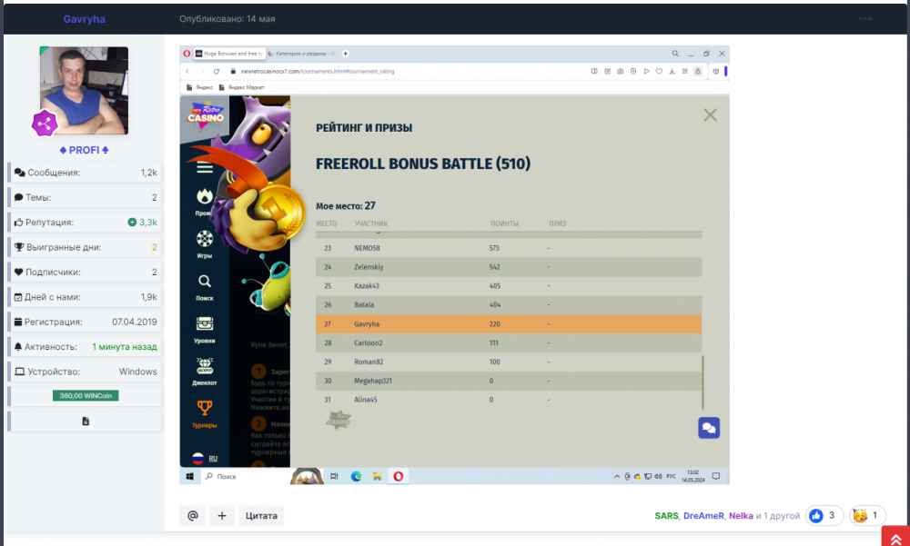 Gavryha Опубликовано 13 мая, 2024 Опубликовано 13 мая, 2024 (изменено) 9 минут назад, SARS сказал: Нифига не понял, но очень интересно. В один день я выиграл х. Мне на следующий день надо х + х результат выкладывать ? Потом (х+х) + (х+х) ? И так далее ? Толь смотри.Сегодня ты за сутки занёс например самый большой выйгрыш на сколько смог 10 руб.Выложил. На вторые сутки опять пытаещся занести ,занес и наибольший занос выкладываешь и предыдущий скрин у тебя будет уже не 10руб а 20 .На третий день у тебя удваивается за второй день,за четвёртый - третий скрин.Самое главное в день выложить скрин с наибольшим заносом и не пропускать дни. Изменено 13 мая, 2024 пользователем Gavryha 2 Цитата