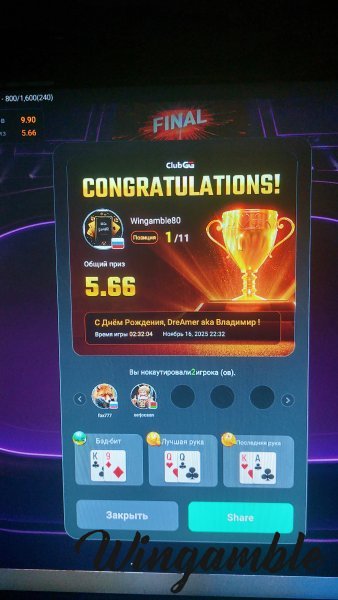 SARS Опубликовано 12 ноября, 2025 Опубликовано 12 ноября, 2025 Дружище Владимир ! Поздравляю Тебя с Днём Рожденья! Желаю Тебе здоровья тебе и близким, полного кошелька, что бы всё задуманное тобой исполнялось, карты хорошей, удачи и путешествий по мере сил и возможностей ! А так же в честь сего прекрасного праздника именинник проводит турнир ! Призовой фонд - 6300 win. Турнир пройдёт 16.11 в 20.00. Регистрация откроется 12.11 в 18.00 Распределение призов в зависимости от числа участников ! Приглашаем Всех желающих на прекрасное празднование и времяпрепровождение ! 4 2 1 2 Цитата