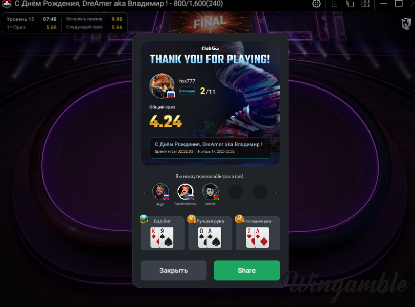 SARS Опубликовано 12 ноября, 2024 Опубликовано 12 ноября, 2024 Результаты турнира. Места и призы: 1 место - @FOX777 1000 win 2 место - @Astin 800 win 3 место - @SARS 700 win 4 место - @gudvin11155 600 win 5 место - @Gavryha 500 win 6 место - @Tyblako 400 win Спасибо Володе за турнир и призовой фонд ! 3 2 2 2 Цитата
