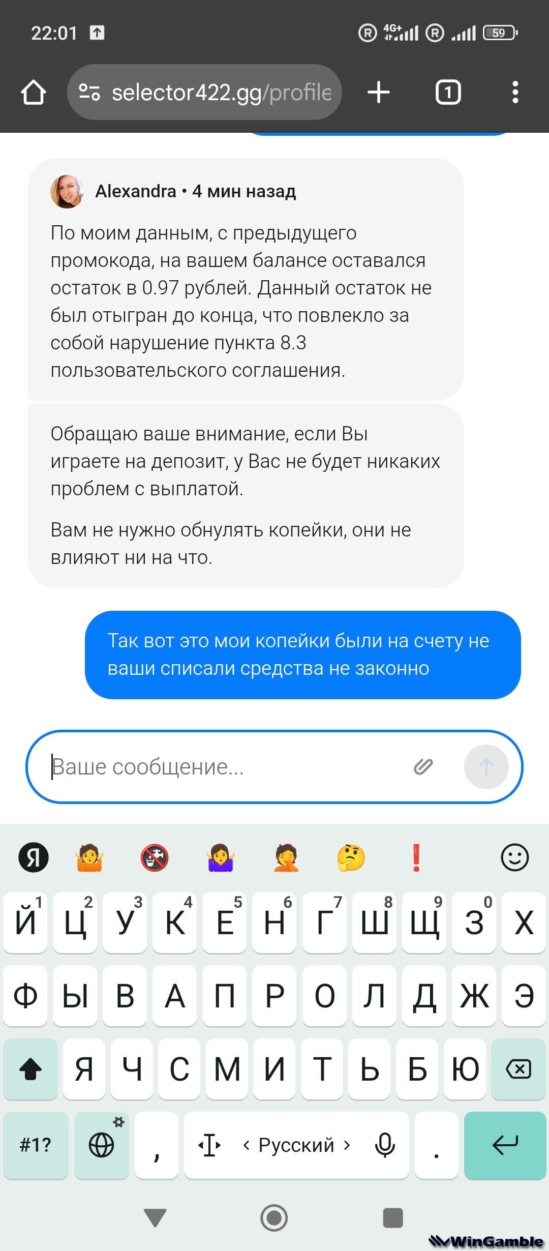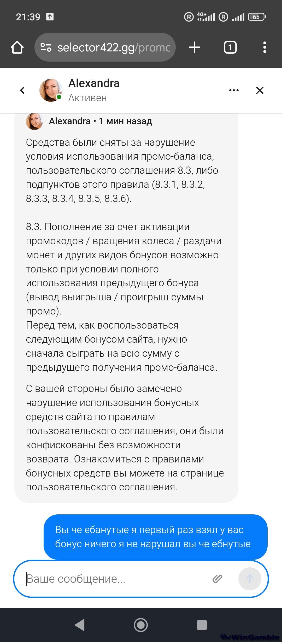 oleg7543 Опубликовано 24 мая, 2025 Опубликовано 24 мая, 2025 Всем привет. Суть такая не играл там давно сегодня захожу на почту висит промик на 1000 без депа . активировал . откатал вейджер х30 проверил по моим под счетом было отбито 33000 поставил на вывод . отменили обратился в саппорт . говарт не открутл вейджер хорошо . пошел еще прокрутил где то 15000 . ставлю на вывод . хоп отмена средства списали . и говорят за нарушения . типо у меня было активно 2 бонуса. Предыдущий был не отбить. Ну когда я зашел на ак у меня на балансе было по-моему 0.30 копеек . просто тупо кидают и все . под предлогом нарушения . не играйте 1 1 Цитата