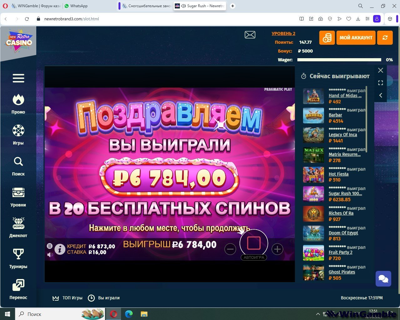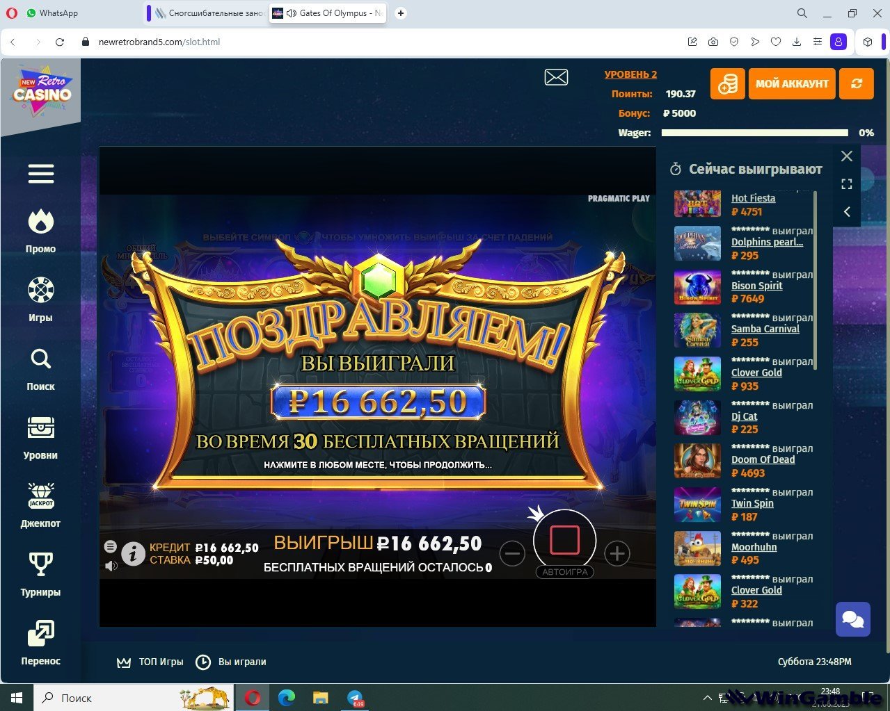 NewRetroCasino Опубликовано 6 июня, 2025 Опубликовано 6 июня, 2025 Период проведения: До 22 июня 2025 года, 23:59 (МСК) Объявление результатов: в течение 72 часов Условия участия 1. Пройти регистрацию на сайте NewRetroCasino и подтвердить электронную почту. 2. (по желанию) Активировать бездепозитный бонус 5 000 ₽ (вейджер ×40) по промокоду WINGAMBLE. Бонусный баланс участвует в конкурсе, но вывести его нельзя. Как выиграть Топ-10 игроков с самым крупным «заносом» в одном из слотов NewRetroCasino получат по 150 Free Spins (FS) Условия для FS: Ставка 10 ₽ Вейджер ×30 Максимальный вывод с фриспинов 2 000 ₽ Для подтверждения результата необходимо в теме конкурса прикрепить полный скриншот, на котором чётко видны дата и время, а также указать свой логин в казино. Бонусное задание Займите любое место в ежедневном турнире «FreeRoll Bonus Battle». Получите бездепозитный промокод на 250 FS (ставка 10 ₽, вейджер ×30, макс. вывод — 3 000 ₽). Промокод придёт вам в личные сообщения на форуме после окончания конкурса. Дополнительный приз вы получите только за факт участия (занятое место) в турнире «FreeRoll Bonus Battle». Обязательно приложите скриншот-подтверждение. 🌟 Не упустите шанс получить тонны фриспинов! Участвуйте ежедневно Сражайтесь за места в «FreeRoll Bonus Battle» Повышайте свой уровень в NewRetroCasino Открывайте денежные бонусы и фриспины! 🔗 Ссылка на регистрацию: Это скрытое содержимое, пожалуйста Войти или Регистрация Будьте первыми — жмите, регистрируйтесь и выигрывайте! 🎰💥 1 1 Цитата